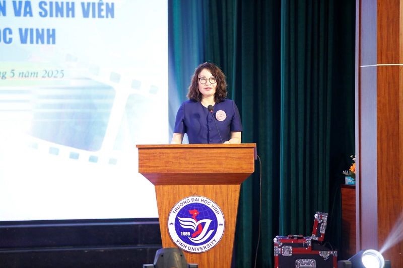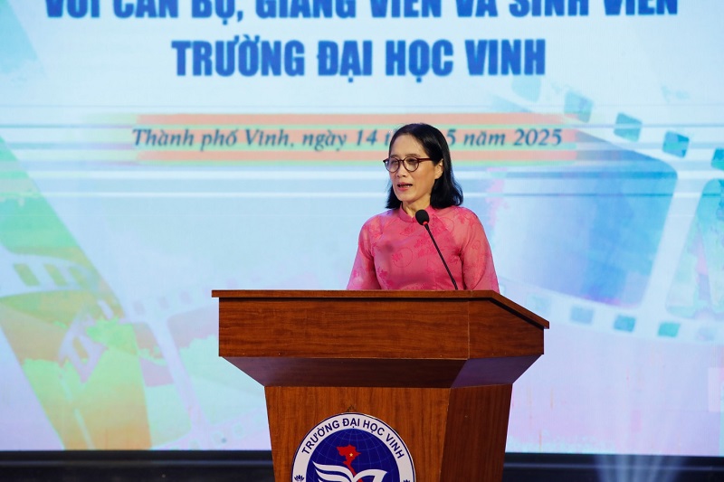 Bà Lý Phương Dung, Phó Cục trưởng Cục Điện ảnh phát biểu khai mạc giao lưu tại Trường Đại học Vinh