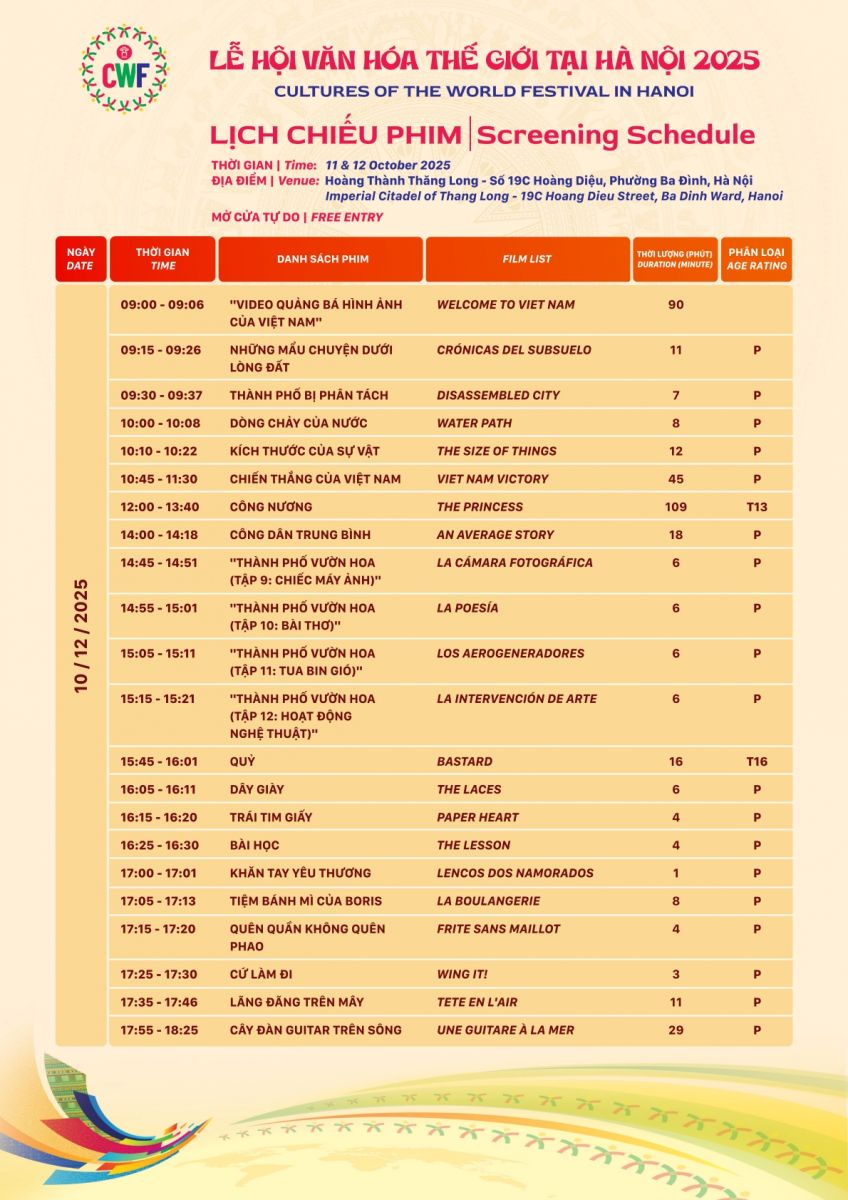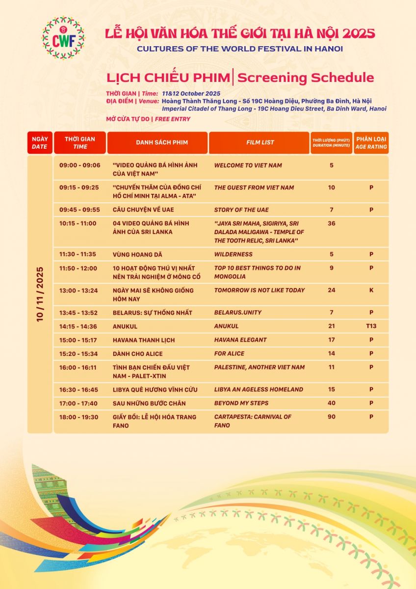 Trong khuôn khổ lễ hội, chương trình chiếu phim quốc tế sẽ liên tục phục vụ khán giả tại Hội trường Hoàng thành (từ 9h đến 21h ngày 11/10 - 12/10/2025).