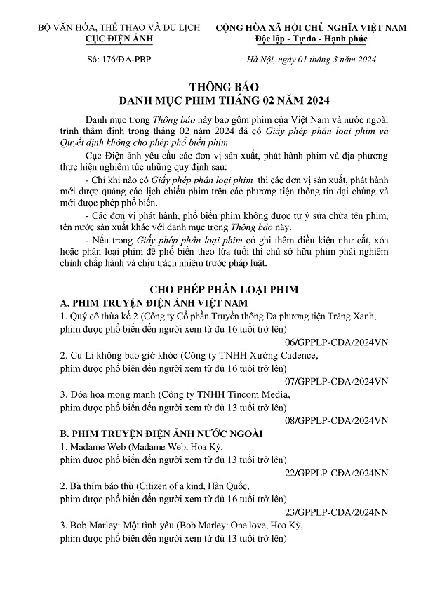 Danh mục trong Thông báo này bao gồm phim của Việt Nam và nước ngoài trình thẩm định trong tháng 02 năm 2024 đã có Giấy phép phân loại phim và Quyết định không cho phép phổ biến phim