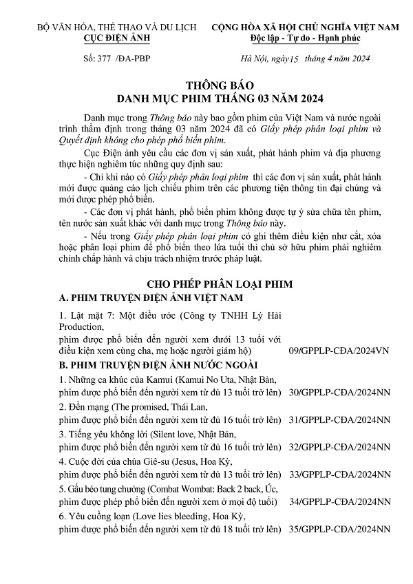 Danh mục trong Thông báo này bao gồm phim của Việt Nam và nước ngoài trình thẩm định trong tháng 03 năm 2024 đã có Giấy phép phân loại phim và Quyết định không cho phép phổ biến phim.