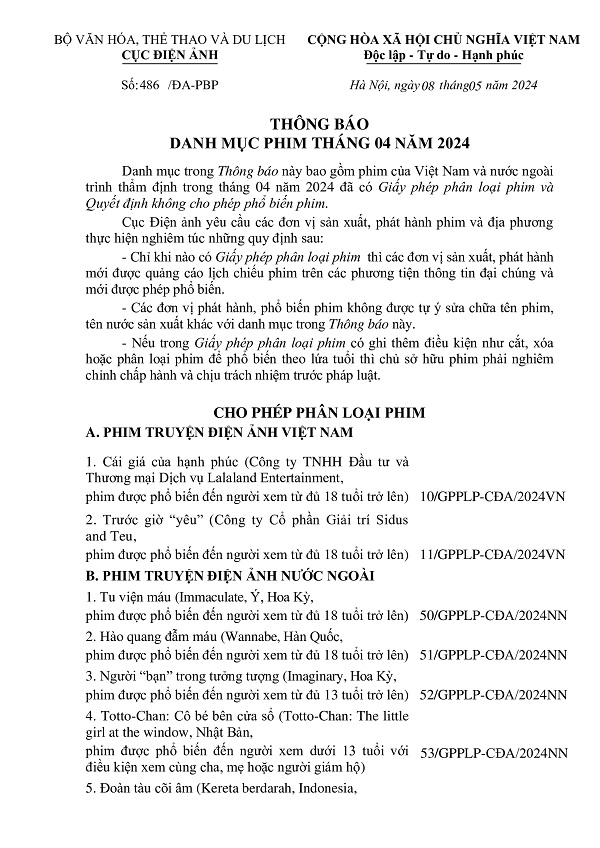 Danh mục trong Thông báo này bao gồm phim của Việt Nam và nước ngoài trình thẩm định trong tháng 04 năm 2024 đã có Giấy phép phân loại phim và Quyết định không cho phép phổ biến phim.