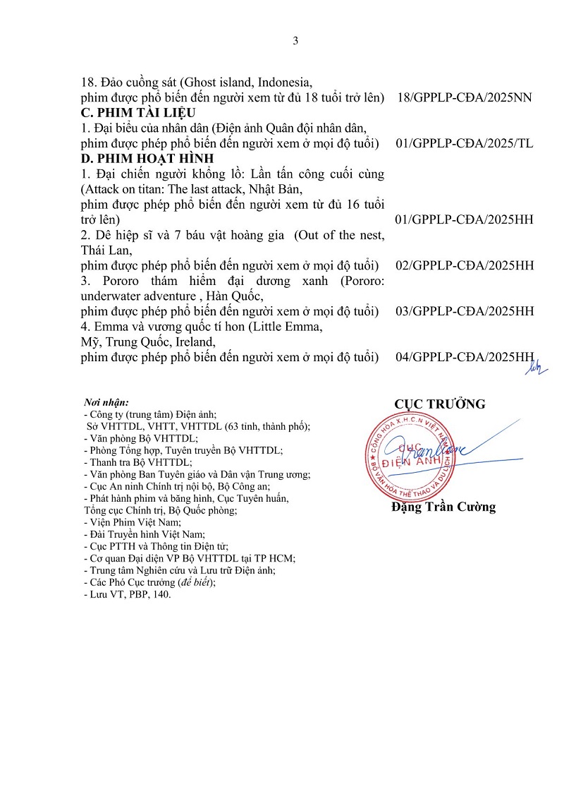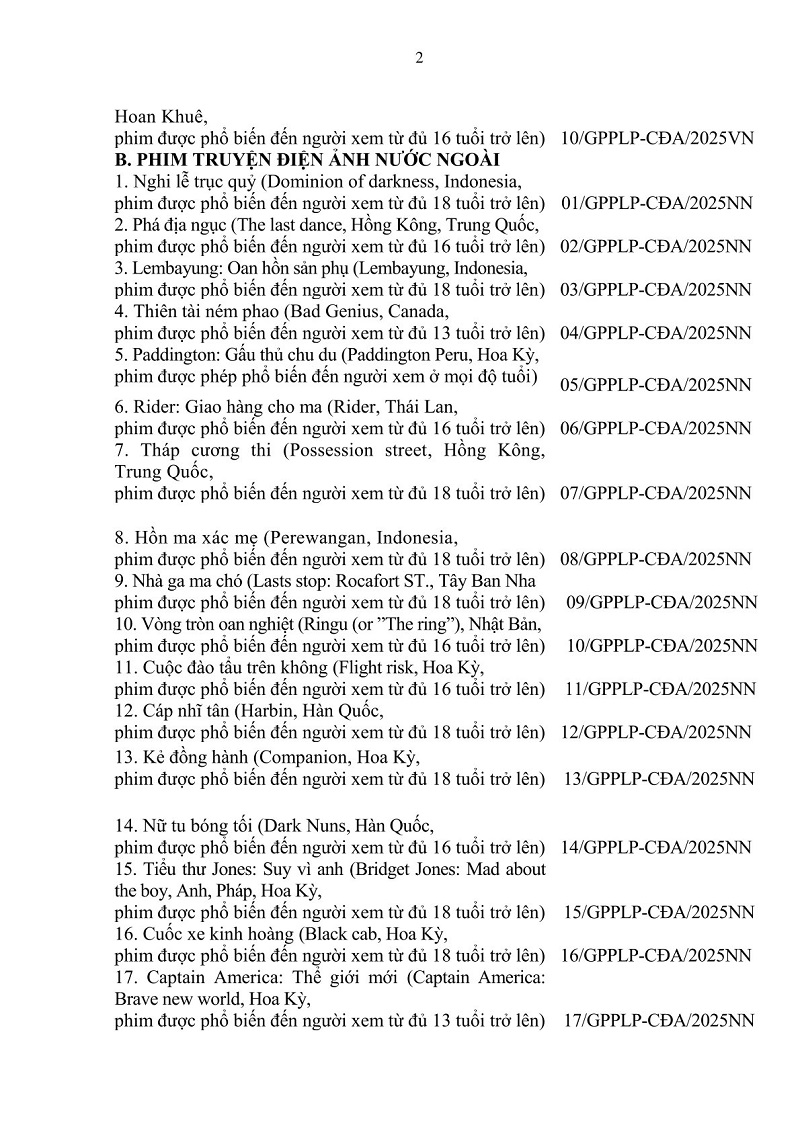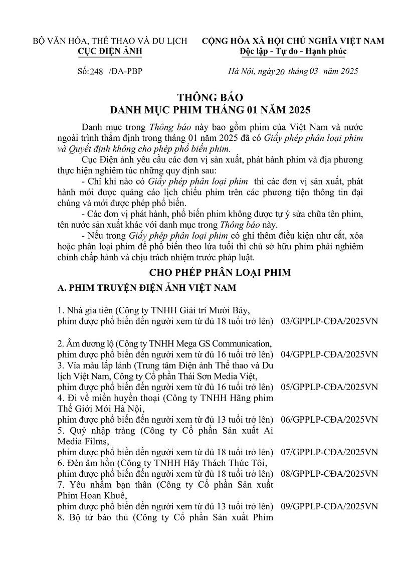 Danh mục trong Thông báo này bao gồm phim của Việt Nam và nước ngoài trình thẩm định trong tháng 01 năm 2025 đã có Giấy phép phân loại phim và Quyết định không cho phép phổ biến phim.