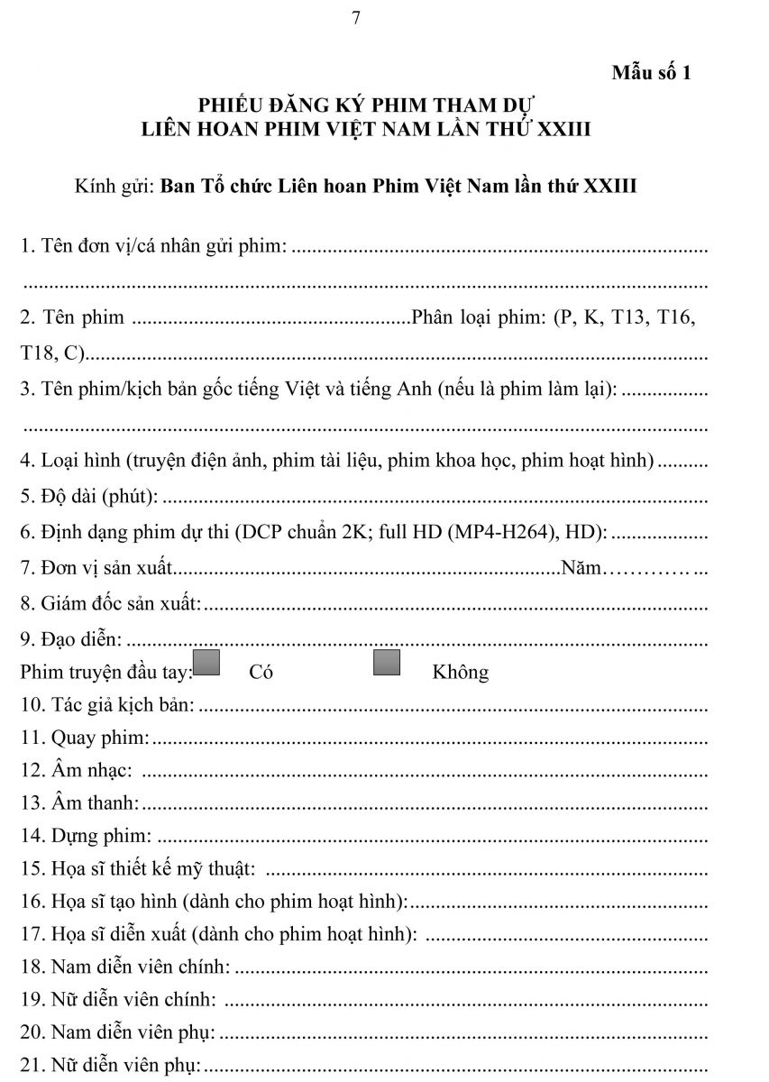 a) Phiếu đăng ký phim tham dự Liên hoan Phim Việt Nam lần thứ XXIII (Mẫu số 1), mỗi phim lập một phiếu riêng;