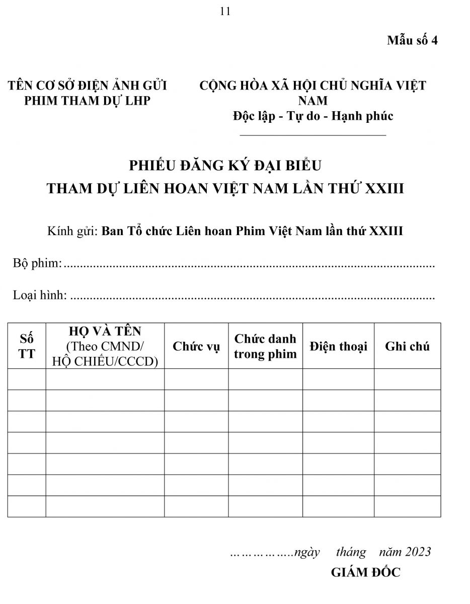 9. Phiếu đăng ký đại biểu tham dự Liên hoan Phim (Mẫu số 4)