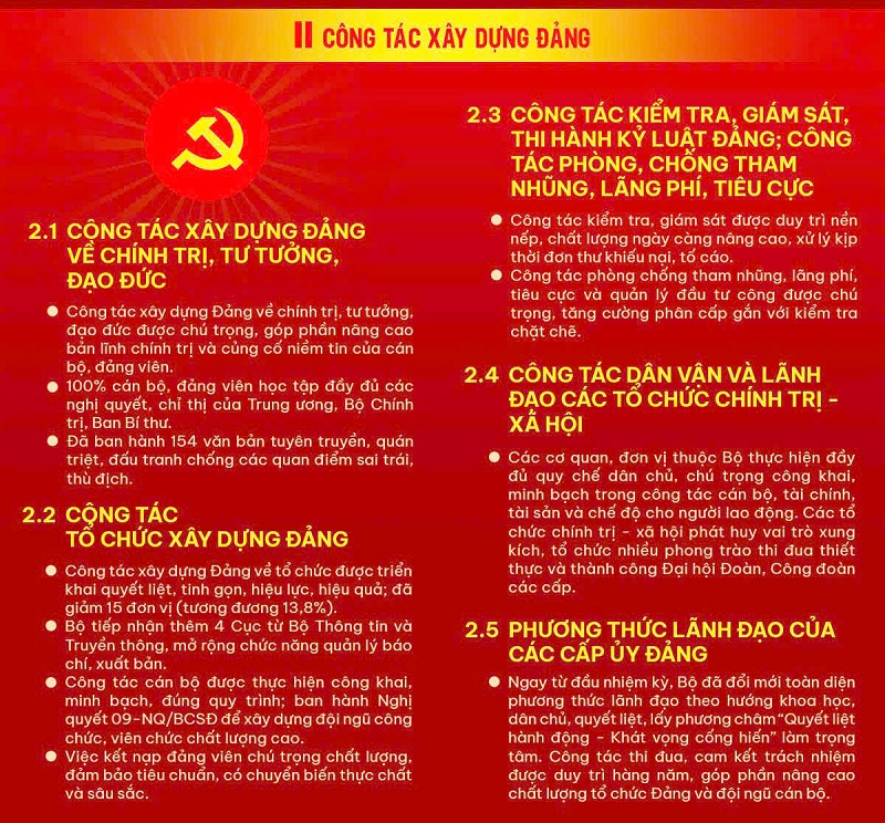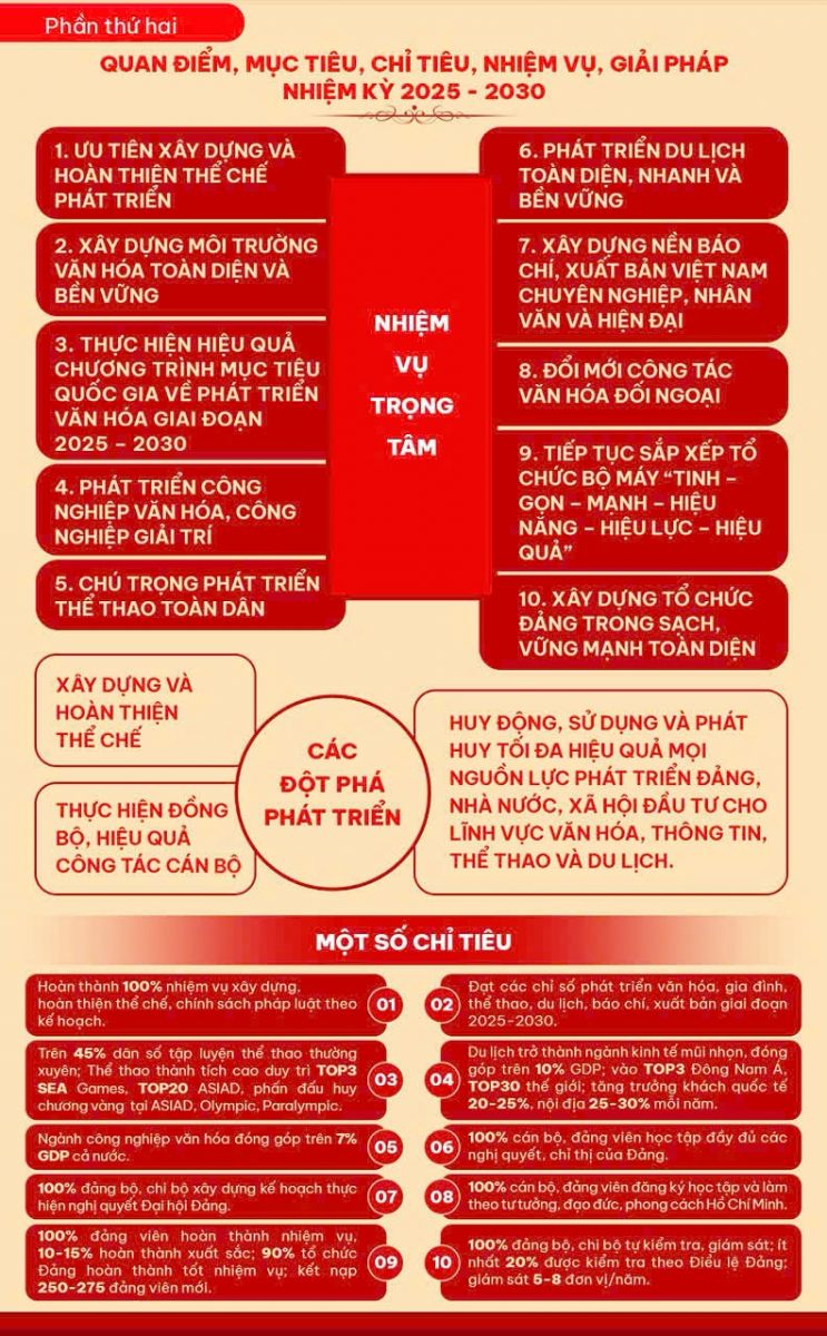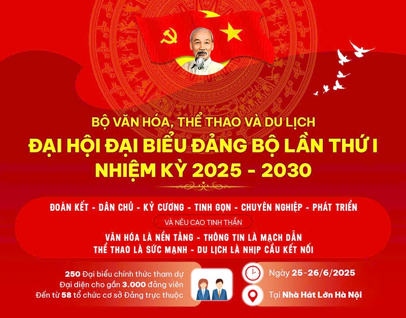 Đảng ủy Bộ VHTTDL đã ban hành Kế hoạch tuyên truyền đại hội đảng các cấp, Đại hội đại biểu Đảng ủy Bộ Văn hóa, Thể thao và Du lịch, nhiệm kỳ 2025-2030 tiến tới Đại hội đại biểu Đảng bộ Chính phủ lần thứ I, nhiệm kỳ 2025-2030 và Đại hội đại biểu toàn quốc lần thứ XIV của Đảng